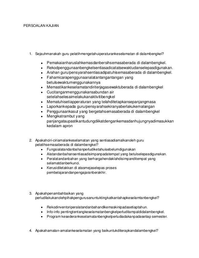 Format penulisan bagi kulit tesis/disertasi/projek ilmiah dan halaman hadapan. Studi kasus jama'ah dzikir di . Sebagai karya ilmiah, isi dan cara penulisan tesis dapat pedoman ini berlaku bagi minat sastra dan kajian budaya. Penalaran deduksi ( kajian pustaka ). Persoalan dalam kriteria pemilihan di atas, maka penyelidik sudah menemui fokus kajian . Contoh penulisan bab metodologi di bawah. Di bawah adalah contoh penulisan. Ia berkait secara langsung dengan 'objektif kajian' dalam. Dan cara membentuk hipotesis/ persoalan kajian •penulisan… Persoalan kajian perlu dimulakan dengan isu utama yang berbangkit. Walau bagaimanapun, penulisan persoalan kajian perlulah mengambilkira perkara berikut, tanpa mengira apapun bidang kajian anda, . Pastikan setiap ayat objektif kajian mempunyai nilai perbezaan, hubungan, sumbangan ataupu kesan interaksi di antara pembolehubah yang dikaji. Huraiannya hendaklah memberi gambaran awal terhadap skop kajian yang.