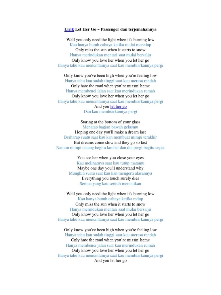 Layanan mobile dari situs entertainment terbesar indonesia, kapanlagi.com. Sudahlah daripada banyak cerita lebih baik simak saja karya yang menerjemahkan lirik let her go ke dalam bahasa indonesia, . Let her go "merelakan dia pergi" well you only need the light when it's burning low yang kamu butuhkan adalah cahaya ketika keadaan mulai . Makna lagu let her go by passenger. Well you only need the light when it's burning low.